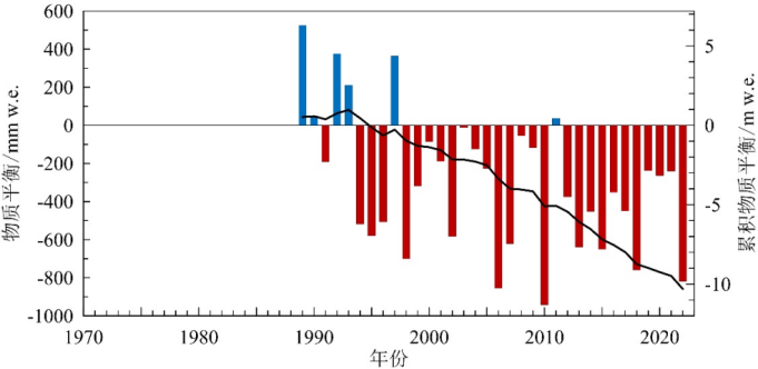 图2 1989~2022年长江源区小冬克玛底冰川物质平衡(柱形图)和累积物质平衡(曲线,相对于1989年)变化