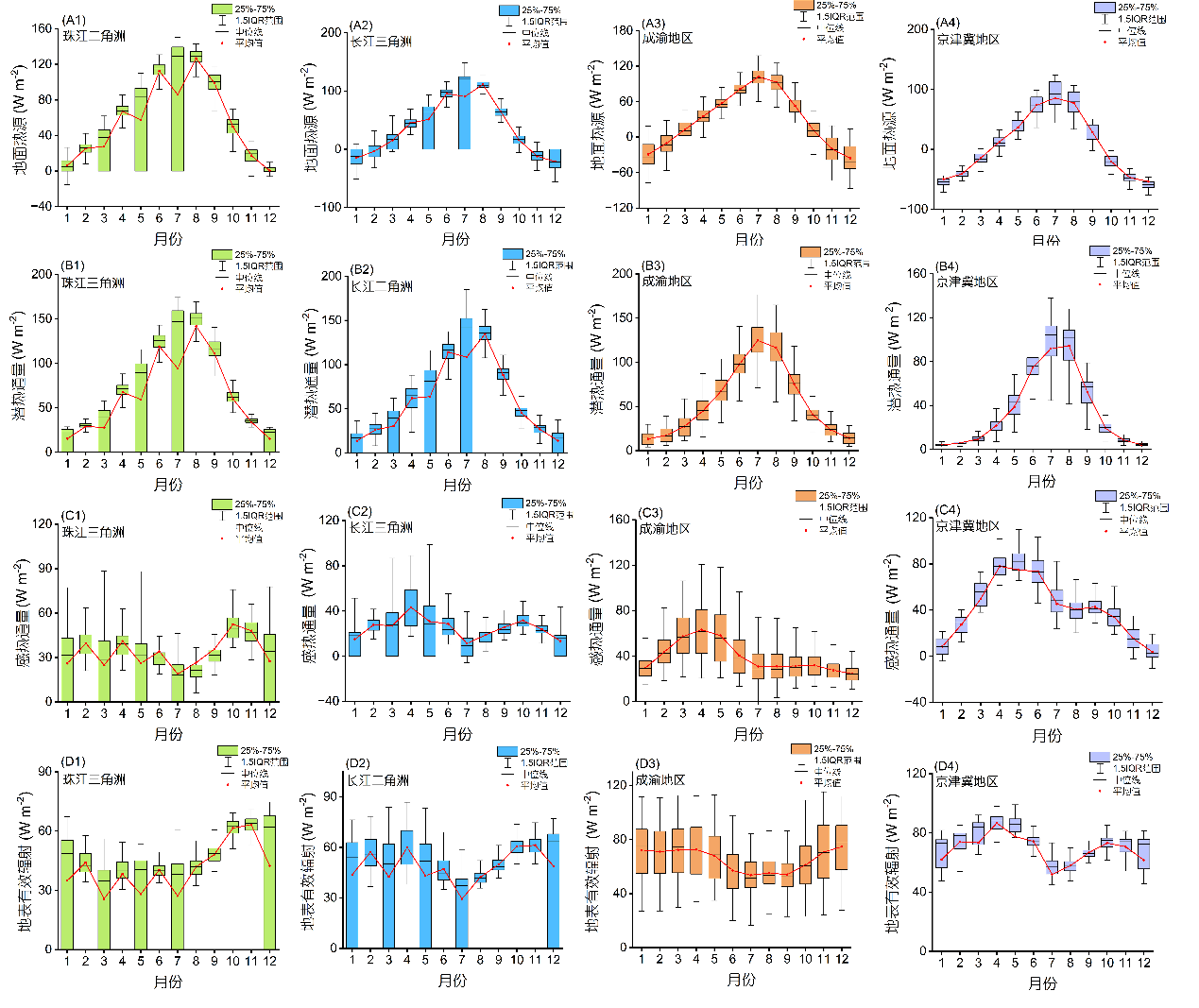 1979–2021年中国4个城市群能量变量的季节变化特征。(A) 地面热源;(B) 潜热通量;(C) 感热通量;(D) 地表有效辐射。1:珠江三角洲;2:长江三角洲;3:成渝地区;4:京津冀地区;红色实线为43年月均值
