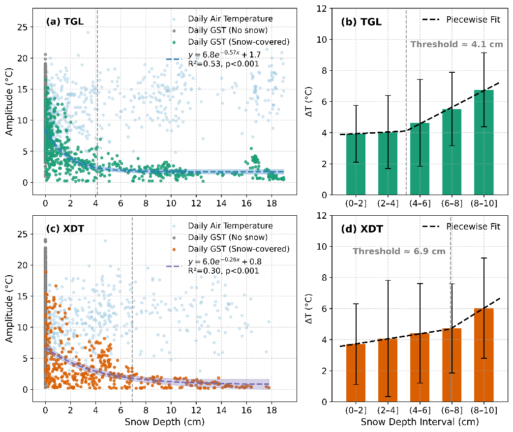 青藏高原是全球最大的高海拔多年冻土区。与北极厚雪稳定的格局不同,青藏高原以浅薄、短暂积雪为主,积雪通过反照率、导热性与融雪潜热调节地–气热量交换,进而影响多年冻土稳定与区域气候。然而,浅雪主导机制长期缺乏实地证据与定量框架。 中国科学院西北生态环境资源研究院与南京信息工程大学联合团队基于多年连续原位观测,系统揭示了雪深的“门槛效应”,在积雪–冻土–能量耦合研究方面取得新进展。 研究发现,当雪深超过4.1 cm(唐古拉)与6.9 cm(西大滩)时,地表温度振幅显著收敛、保温效应确立;而在7 cm)。该框架刻画了从强地–气耦合的冷却阶段,跨越阈值进入稳定保温阶段的演变路径,为浅雪主导区的雪–地相互作用提供了可操作的判据与参数化思路。 研究表明,在气候变暖与积雪减少背景下,若忽视浅雪的冷却效应,可能系统性低估其对冻土降温与能量通量调节强度。本研究将深度敏感、阈值感知的积雪过程纳入寒区陆面与气候模型,对提升冻土演变与极端事件风险评估的准确性具有重要意义。 研究成果以Threshold-governed insulating and cooling effects of snow cover on alpine permafrost: evidence from the Qinghai–Tibet Plateau为题,发表在国际权威期刊 Agricultural and Forest Meteorology 上。西北研究院肖瑶助理研究员为论文第一作者,胡国杰研究员与南京信息工程大学赵林教授为通讯作者。该研究得到国家自然科学基金、中国科学院青促会、国家重点研发计划及冰冻圈科学与冻土工程全国重点实验室等的资助。 论文链接:https://doi.org/10.1016/j.agrformet.2025.110802 积雪厚度与地表温度响应的阈值关系 不同雪深条件下反照率、净辐射和土壤热通量变化 雪深对地表能量通量的非线性影响及阈值效应 积雪调控冻土与能量的机制框架