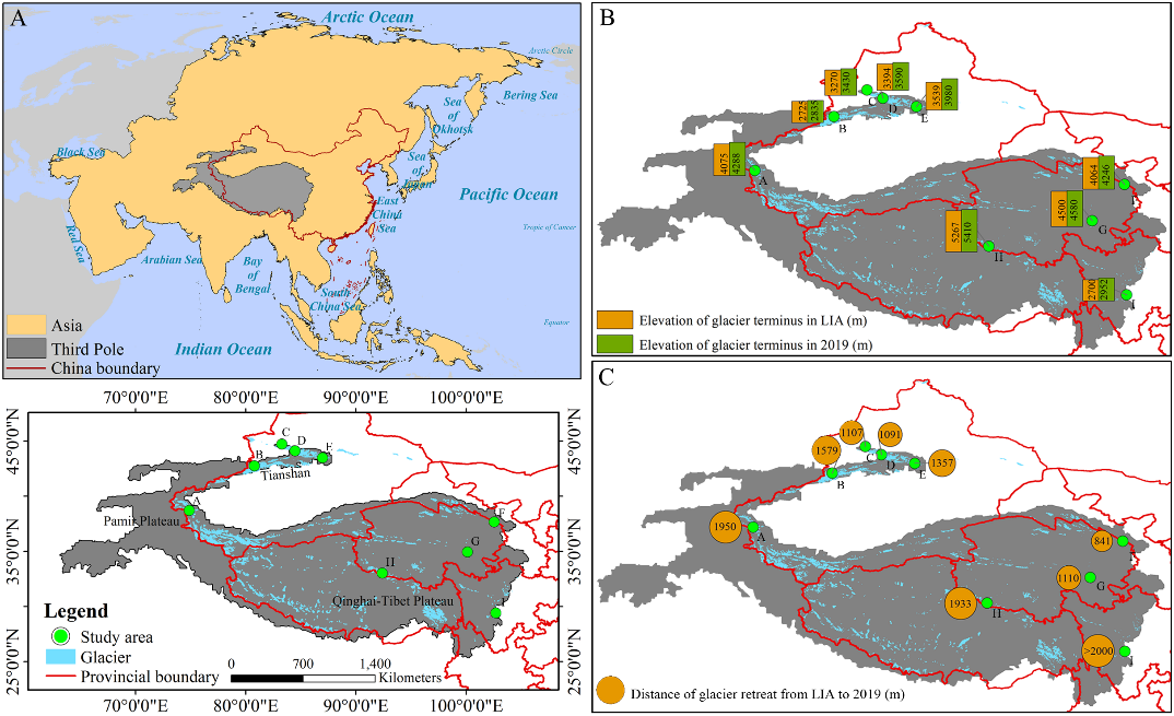 青藏高原及周边高山地区统称为“第三极”地区,是除南北极外最大的冰川集中区。在全球气候变暖背景下,第三极地区正经历显著增温,气温上升加速了冰川消融,进而影响区域生态平衡。第三极冰川前缘作为海拔最高的陆地脆弱生境之一,对气候及冰川变化响应敏感。深入了解冰川前缘植被动态,对科学评估冰缘生态系统响应气候至关重要。然而,受制于观测条件,目前仍缺乏对该地区冰缘植被的大范围系统性观测研究。 中国科学院西北生态环境资源研究院上官冬辉研究员团队与兰州交通大学、中巴地球科学联合研究中心及南通大学相关研究团队合作,选取第三极地区9条代表性冰川,在其前缘布设样地并获取植被信息。利用植被指数量化了冰川退缩时间序列上植物群落特征的变化,并结合植物区系相似性指数,系统分析了不同样地间及不同冰川前缘间的植物区系相似性。 研究显示,物种多样性和植被盖度沿冰川退缩时间序列呈波动增加趋势,且在海洋性冰川前缘的增加速率尤为显著。所有冰川前缘的植物生活型在演替早期阶段较为相似,但随着演替推进,生活型组成开始分化,在不同类型冰川前缘间差异更为明显。此外,不同冰川前缘间具有植物区系相似性,其中地理位置邻近且属于同一类型冰川的前缘地区植物区系相似性最高。 该研究揭示了局地气候与地理因子在塑造冰川前缘生态系统及植物区系格局中扮演的关键作用,为阐明气候变化对冰川前缘生态系统的影响提供了科学依据,并为区域生物多样性保护工作提供了理论指导。 该成果以Vegetation successional dynamics and floristic similarity across various glacier forelands in the third pole为题发表于国际知名学术期刊Global and Planetary Change上。兰州交通大学魏天锋副教授为本文第一作者,西北研究院上官冬辉研究员为本文通讯作者。研究得到中国科学院战略性先导科技专项(A类)和国家自然科学基金等项目的资助。 论文链接:https://doi.org/10.1016/j.gloplacha.2025.104916 (A)研究区地理区位图,(B)被研究冰川在小冰期和2019年的冰川末端海拔,(C)被研究冰川在小冰期至2019年间的冰川退缩距离