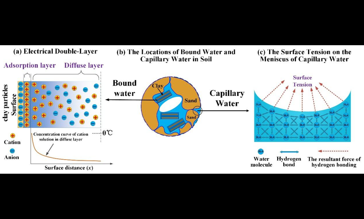 冻土中的未冻水变化是土体水-热-力耦合过程的重要内容。现有的未冻水理论模型主要基于土水势理论,其表征基质势、含水量关系的土水特征曲线存在显著个体差异,且缺乏以土壤物理性质为基础的参数化方案,制约了未冻水模型的参数化与推广应用。中国科学院西北生态环境资源研究院冰冻圈科学与冻土工程全国重点实验室科研团队对冻土未冻水(主要是结合水)与电解质溶液进行了同源性研究。结果表明,冻土中复杂的相变过程与“盐水冰点低于0℃”“公路撒盐除冰”等日常现象具有相同的理化机制。研究通过将电解质溶液相变机制与双电层理论相结合,构建了冻土未冻水理论模型,定量刻画了土壤盐分(溶液浓度、溶质种类及比例)、表面电荷密度、温度以及土壤类型(比表面积)等因素对未冻水含量的影响,克服了传统土水势模型难以实现物理参数化的固有局限。此外,研究推导出三种不同形式的未冻水模型表达式,不仅在统一的理论框架下涵盖了十余种半经验模型,而且为这些半经验公式提供了清晰的物理机制和参数对应关系,有助于厘清不同模型之间的差异及其适用条件,降低模型选择和参数标定的不确定性,为冻土水–热–力耦合数学模型中水-冰相变过程提供了参数化基础。相关研究成果以Parameterized modeling of unfrozen water in frozen soil based on the freezing characteristics of multicomponent cation solutions and the electrical double‐layer theory of clay colloids为题,发表于国际权威期刊Water Resources Research。西北研究院冰冻圈科学与冻土工程全国重点实验室高晓清研究员为第一作者,靳潇助理研究员为通讯作者。研究得到中国科学院基础与交叉前沿科研先导专项、国家自然科学基金等的资助。论文链接:https://agupubs.onlinelibrary.wiley.com/doi/full/10.1029/2025WR040886结合水和毛细水成赋存形态和形成机制示意图