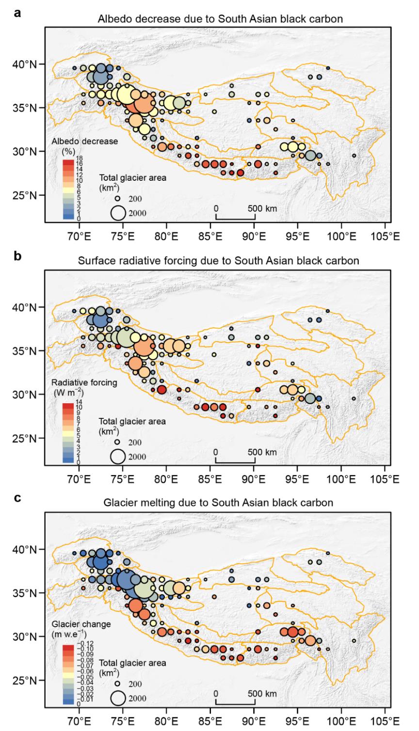 黑碳是由化石燃料和生物质不完全燃烧产生,仅次于二氧化碳的大气升温因子,具有强烈的吸光性。青藏高原毗邻南亚黑碳高排放区,南亚的黑碳气溶胶能够跨越喜马拉雅山输送到青藏高原内陆地区。南亚黑碳的排放和传输可通过直接和间接效应,加速青藏高原冰川消融,威胁亚洲水塔。近日,中国科学院西北生态环境资源研究院康世昌研究员课题组,联合清华大学陈德亮教授、美国犹他州立大学犹他州气候中心Robert教授,发现南亚黑碳气溶胶通过增加消融和减少冰川物质补给,加速了以冰川退缩为主的青藏高原固体水储量损失,尤其在喜马拉雅地区及其孕育的印度河、恒河-布拉马普特拉河流域最为显著。前期研究发现,南亚黑碳导致中高层大气增温,增强了区域对流活动,使得水汽在南亚辐合,黑碳增加了大气中的云凝结核数量。黑碳引起的这些气象条件变化,使得更多的水汽在南亚形成降水,由此传输到青藏高原的水汽减少,降水也随之减少,进而导致青藏高原冰川的物质补给减少。在此基础上,本研究在区域尺度上量化了南亚黑碳对高原冰川表面反照率和冰川消融的影响,进一步评估了南亚黑碳对青藏高原冰川变化的直接消融效应和间接降水补给效应,并深入探究其对流域水储量的影响。结果表明,2007至2016年间,南亚黑碳沉降使青藏高原冰川反照率降低,导致消融量增加7.5%;同时南亚黑碳导致的高原降水减少带来冰川物质负平衡(亏损)增多6.1%;其中,喜马拉雅地区尤为显著,冰川物质负平衡增幅达到33.7%。冰川物质亏损导致陆表水储量减少,其中青藏高原南部流域陆表水储量减少显著,尤其在印度河与恒河-布拉马普特拉河等内流盆地。南亚黑碳导致印度河流域水储量整体下降18.9%,其主要驱动机制是黑碳加速冰川消融的直接效应,而恒河-布拉马普特拉河流域的水储量减少25.7%主要是黑碳显著的间接效应所致,即黑碳改变大气环流所引发的降水补给减少。未来南亚黑碳排放仍将持续增加,其影响还会加剧。因此,为了保护“亚洲水塔”,南亚地区黑碳减排势在必行。该成果以Reduced solid water storage over the Tibetan Plateau caused by black carbon为题,以Articles形式发表在国际知名期刊Communications Earth & Environment上。该研究获得国家自然科学基金、中国科学院西部之光交叉团队项目、甘肃省杰出青年基金等项目的资助。论文链接:https://doi.org/10.1038/s43247-025-02335-9南亚黑碳对青藏高原冰川表面反照率(a)、辐射强迫(b)、消融(c)的影响南亚黑碳通过直接消融效应与间接补给效应对青藏高原重点流域陆表水储量(GT/yr)变化的影响