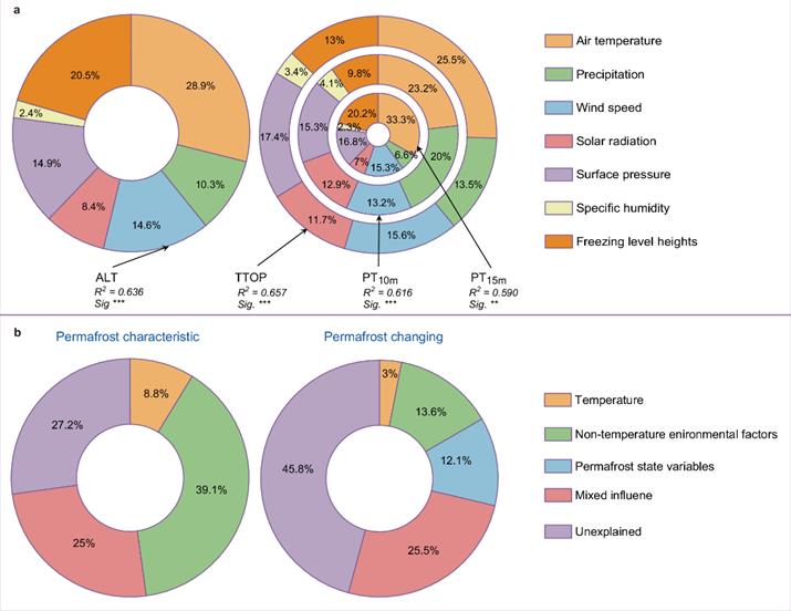 青藏高原分布着全球最大的高海拔连续多年冻土区,其稳定性对碳、水和养分循环以及生态系统服务和工程安全具有重要意义。近年来,气候变暖导致的多年冻土退化加剧,严重威胁区域生态与基础设施。然而,长期以来,人们更多关注气温升高所带来的影响,对非温度环境因子影响多年冻土变化的机制尚不明确。中国科学院西北生态环境资源研究院冰冻圈科学与冻土工程全国重点实验室吴青柏团队整合了2001至2020年间青藏高原55个原位监测站点数据,系统研究了多年冻土变化的时空特征及其驱动因子。研究发现,高原多年冻土退化正在加速。活动层厚度增加速率由2001至2010年的45±15 cm/10年,增至2011至2020年的86±30 cm/10年,近地表多年冻土温度升温速率也几乎翻倍。值得注意的是,气温仅能解释不足20%的多年冻土变化,而降水、风速、自由空气冻结层高度等非温度因子整体贡献率达45%。尤其是降水在34°N南北表现出相反效应,北部降水增加加速多年冻土升温和活动层加深,而南部降水增加则促进多年冻土降温与活动层变浅。该研究揭示了气候与环境因子协同作用下青藏高原多年冻土退化机制的影响路径,强调非温度因子在多年冻土退化中的关键作用,突破了以往对“气温主导”多年冻土变化的认识,为改进碳、水、养分循环模拟和保障青藏高原重大工程设施安全提供了新思路。相关成果以 Non-temperature environmental drivers modulate warming-induced 21st-century permafrost degradation on the Tibetan Plateau 为题发表于国际期刊 Nature Communications。西北研究院博士后付子腾为论文第一作者,吴青柏研究员为共同第一作者和通讯作者。该研究得到国家自然科学基金、科技部重点研发计划项目、冰冻圈科学与冻土工程全国重点实验室自主部署课题和甘肃省博士后专项的资助。论文链接:https://doi.org/10.1038/s41467-025-63032-x 不同环境因子对青藏高原多年冻土特征及其变化的相对贡献