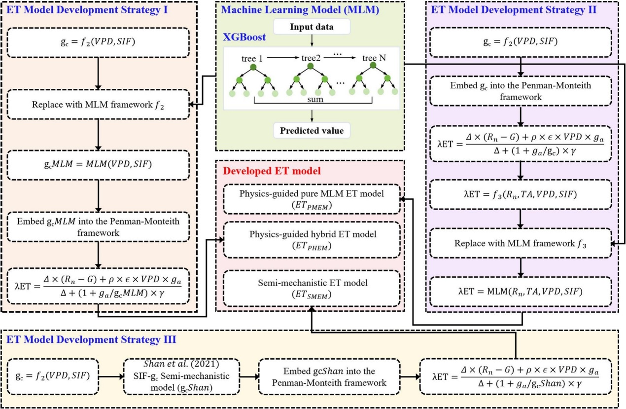 日光诱导叶绿素荧光(SIF)作为直接的光合活性指标,对陆地蒸散量(ET)的动态监测、模型优化及区域碳-水耦合研究具有重要价值,并对气候变化评估、水资源管理指导和田间灌溉决策产生重大影响。然而,由于模型存在的结构误差和参数误差,利用遥感SIF估算ET仍具有较大的挑战。近日,中国科学院西北生态环境资源研究院祁连山冰冻圈与生态环境综合观测研究站研究团队构建了两种融合物理约束与机器学习方法的SIF驱动耦合ET模型,即物理引导混合ET模型(ETPHEM)和物理引导纯机器学习ET模型(ETPMEM)。ETPHEM模型利用机器学习框架改进冠层气孔导度-SIF物理模型(gc -SIF模型),再将改进的机制模型镶嵌至Penman-Monteith模型框架,构建ET模型。ETPMEM模型则将gc -SIF模型物理模型嵌入Penman-Monteith模型框架,再利用机器学习框架改进镶嵌gc -SIF物理模型后的Penman-Monteith模型,最终形成ET模型。此外,研究人员利用全球包含8种植物功能类型的52个站点评估了2种耦合ET模型的性能,并与SIF驱动的半机理ET模型进行了比较,分析了两种耦合ET模型的泛化性能和建模ET的优势。研究表明,结合物理约束和机器学习模型的2种SIF驱动的耦合ET模型,表现出比SIF驱动的半机理ET模型更好的模型性能,与地面的观测结果最为接近。2种SIF驱动的耦合ET模型中,ETPMEM模型得到了最为准确的ET估算,能较准确地捕捉ET的季节动态,其整体决定系数(R2)、均方根误差(RMSE)、平均绝对误差(MAE)和克林-古普塔效率系数(KGE)分别为0.84、0.58mm/day、0.39mm/day和0.88,且ETPMEM模型计算的所有站点ET多年总均值为1.79mm/day,基本接近站点观测的ET多年总均值1.80 mm/day。2种SIF驱动的耦合ET模型在多种极端环境条件中和数据稀疏区域具有较强的泛化性能。该研究为利用遥感技术开展全球尺度蒸散发估算提供了重要的理论支持与方法参考。该研究成果以Improving terrestrial evapotranspiration estimation using physics-guided machine learning model driven by solar-induced chlorophyll fluorescence为题发表于国际期刊Journal of hydrology。西北研究院博士研究生王仁军为论文第一作者,秦翔研究员为论文共同第一作者和通讯作者。该研究得到甘肃省生态文明重点研发计划、甘肃省重大科技专项、冰冻圈科学与冻土工程全国重点实验室自主部署项目和甘肃省教育厅高校教师创新基金项目等联合资助。论文链接:https://doi.org/10.1016/j.jhydrol.2025.133468SIF驱动的ET模型开发框架