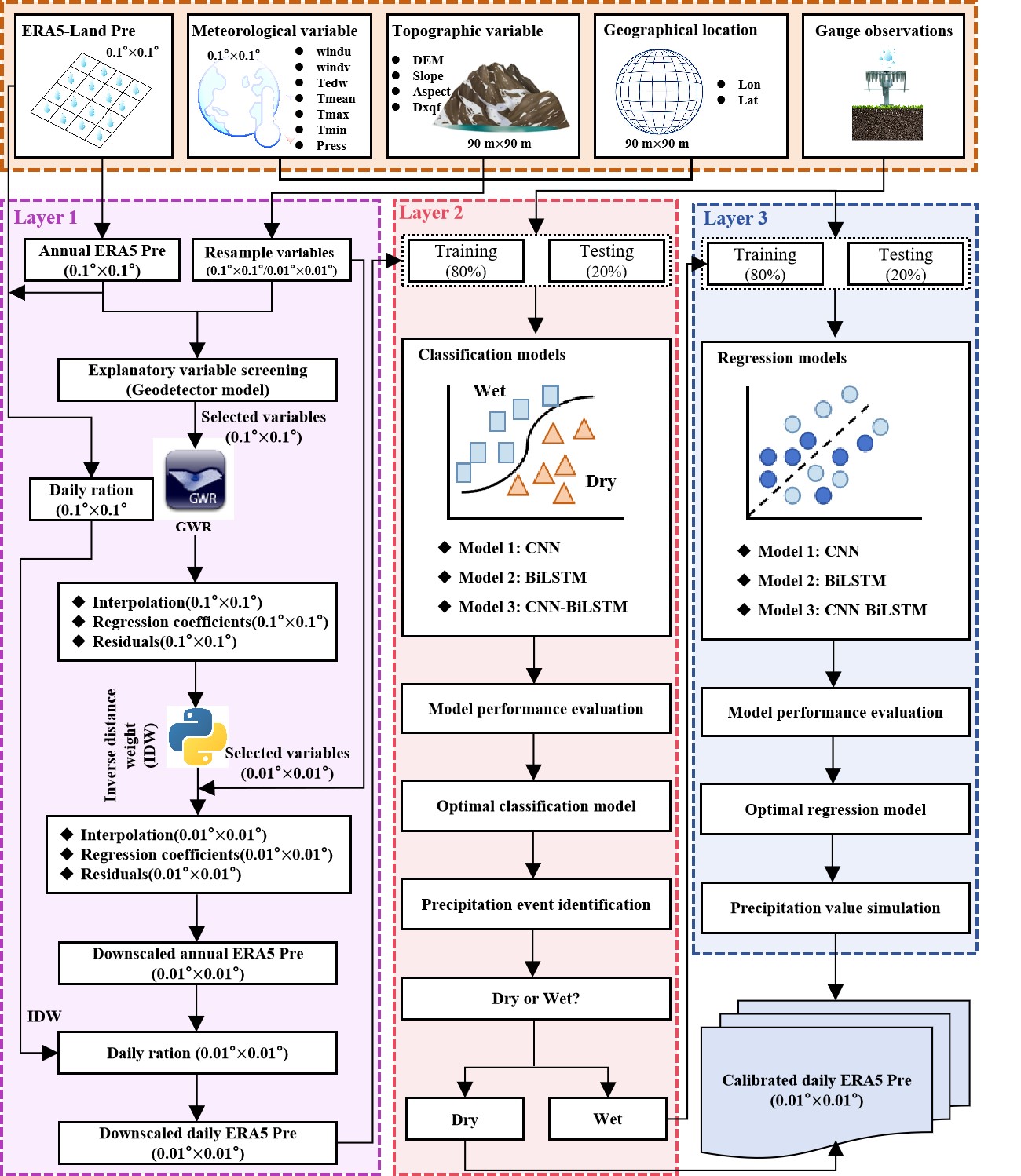 降水(Precipitation,Pre)作为陆地水文循环的重要环节,在维持地-气系统能量平衡中发挥着关键作用。高精度网格降水数据对水文和气候研究至关重要,特别是在地面观测资料稀缺的高寒山区。然而,现有网格降水数据分辨率低、偏差大。因此,亟需研发创新方法以满足时空异质性强的高寒山区应用需求。近日,中国科学院西北生态环境资源研究院祁连山冰冻圈与生态环境综合观测研究站研究团队基于先进的人工智能技术,开发了一种称为三层智能化降尺度-校正(TLIDC)的新框架,旨在生成适用于高寒山区高精度的网格降水数据集。研究人员使用祁连山区100个雨量站数据完成了对TLIDC框架的定量评估,并应用该框架重建了1950至2024年祁连山0.01°*0.01°空间分辨率的日降水数据。研究发现,TLIDC框架能够生成可靠、高精度的降水数据,精度优于目前主流的降水数据集,有效改善了地面观测数据匮乏导致的地区降水数据精度误差。此外,研究人员还利用高分辨率祁连山降水(HQLM-PRE)数据分析了1950至2024年祁连山降水数据的时空变化特征。结果表明,1950至2024年祁连山降水整体呈增加趋势,线性增长速率为每10年增加2.49毫米(p<0.05),但不同子流域的变化趋势有所差异。1950至2024年祁连山降水的空间格局呈自东南向西北减少的趋势,且分布表现出海拔依赖性。该研究成果为在地形复杂、观测稀疏的高寒山区生成高精度降水数据提供了可行方案,有效弥补了当前高寒山区气候与水文研究中的关键空白。该研究成果以Reconstruction of High-Precision Gridded Precipitation Dataset in the Alpine Cold Regions of the Qilian Mountains: An Intelligent Technological Framework from Downscaling to Calibration为题发表于国际期刊Atmospheric research。西北研究院博士研究生王仁军为论文第一作者,秦翔研究员为论文通讯作者。该研究得到甘肃省生态文明重点研发计划、甘肃省重大科技专项、甘肃省水资源基础调查、冰冻圈科学与冻土工程全国重点实验室自主部署项目等联合资助。论文链接:https://doi.org/10.1016/j.atmosres.2025.108387 TLIDC技术框架。TLIDC框架整体分为三部分:降水数据的空间降尺度(表示为Layer 1)、降水事件的识别(表示为Layer 2)和降水量的模拟(表示为Layer 3)。Layer 1通过GWR模型,提供高空间分辨率的降水数据,Layer 2和Layer 3利用构建的CNN-BiLSTM模型来提高降尺度后降水数据的准确性1950-2024年祁连山降水重建结果及时空变化特征。(a)重建降水的空间分布;(b) Sen’s趋势估计与Mann-Kendall显著性检验结果;(c)祁连山降水时空变化的趋势类型;(d)各子流域降水时空变化的趋势类型。