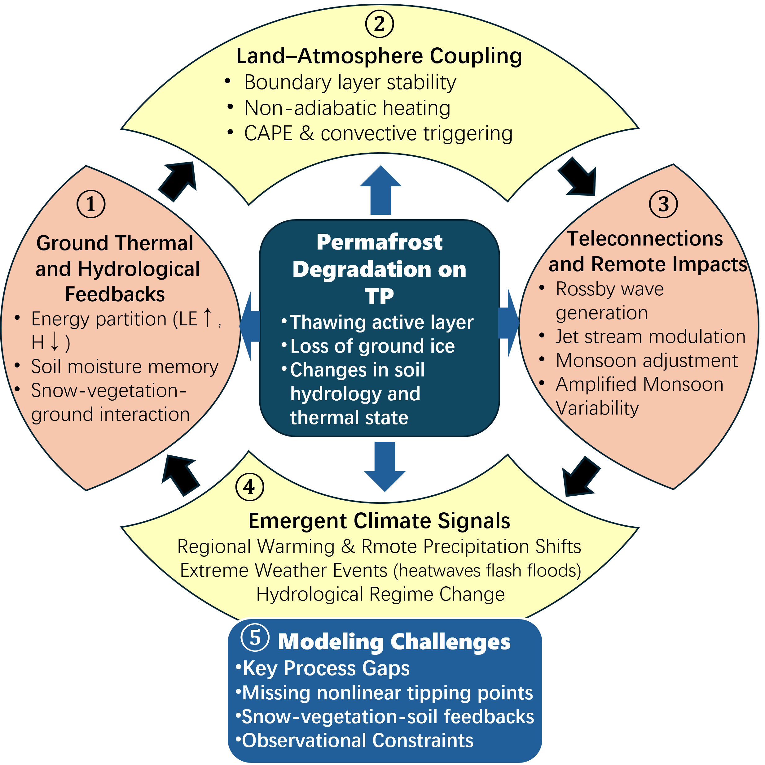 青藏高原是全球最大的高海拔多年冻土区,长期以来的研究多集中于其碳循环功能。在全球变暖背景下,其在能量与水分耦合过程中的作用正在被重新认识。多年冻土不仅是全球最大的高海拔“碳库”,更通过调控地表能量分配和水分循环,深刻影响青藏高原乃至全球的气候格局。近日,中国科学院西北生态环境资源研究院与南京信息工程大学联合团队在多年冻土–气候反馈研究中提出将传统以碳反馈为核心的研究框架拓展至能量与水分耦合驱动的气候反馈机制,系统揭示了多年冻土在塑造区域和全球气候中的主动作用。研究团队依托长期野外观测、遥感反演和过程模拟,完整描绘了“地表能量分配→边界层演变→季风与行星波响应”的多尺度反馈链条。结果表明,多年冻土的“冻融记忆”,即冻结或融化状态在季节间延续并影响后续热量与水分过程,并对土壤热物理特性及潜热/显热分配造成影响,共同决定了能量释放的节奏与路径,进而影响边界层稳定性、对流触发和大气遥相关结构。研究指出,现有地球系统模型(ESMs)在相变热力过程、雪–土–植被耦合和跨季节水分记忆等方面存在显著低估。为此,团队提出了可操作的模型改进路径,包括优化参数化方案、强化多圈层耦合逻辑,并引入长期连续观测验证,以提升气候预测精度和极端事件风险评估能力。该成果题以 Beyond carbon: Multi-scale thermal and hydrological feedback of permafrost on the Tibetan Plateau为题,发表于地学一区TOP期刊 Earth-Science Reviews。西北研究院肖瑶助理研究员为论文第一作者,胡国杰研究员与南京信息工程大学赵林教授为通讯作者。该研究获得国家自然科学基金、中国科学院青促会、国家重点研发计划及冰冻圈科学与冻土工程全国重点实验室等资助。论文链接:https://doi.org/10.1016/j.earscirev.2025.105248青藏高原多年冻土退化驱动的非碳气候反馈机制框架冻土区季节性能量通量与地下水文过程示意图春季陆气耦合过程动力学模型青藏高原至全球尺度的气候反馈路径图谱