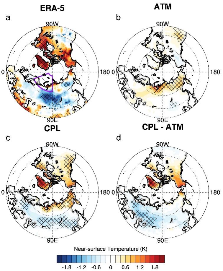 近十年来,欧亚大陆冬季频繁遭遇极端寒潮事件,对人民生命财产和社会经济发展造成严重威胁。以往研究多将寒潮频发归因于北极海冰消融,但基于大气模式模拟的降温信号远弱于实际观测结果。近年来也有研究强调大气内部变率的主导作用,然而大多忽略了海–气耦合过程的影响,可能低估了海冰消融的实际贡献。中国科学院西北生态环境资源研究院冰冻圈科学与冻土工程全国重点实验室研究团队联合英国埃克塞特大学James Screen教授和兰州大学田文寿教授团队等,揭示了海–气耦合过程在北极海冰消融引发欧亚冬季寒潮中的关键作用,指出其在历史时期(1979–2020年)显著放大了海冰消融导致的寒潮强度。研究通过对比仅考虑大气过程的大气模式试验与包含海–气耦合过程的全耦合模式试验发现,全耦合试验成功再现了与观测接近的寒潮降温信号,而大气试验中的响应则十分微弱。进一步分析表明,海冰消融通过海–气耦合过程引发北大西洋和北太平洋海表升温异常,促进大气向极地输送更多热量,引起北极深增温现象,激发了向欧亚大陆传播的罗斯贝波列,进而增强了西伯利亚高压、东亚大槽及阿留申低压等环流系统,为寒潮爆发提供了有利条件。研究指出,到本世纪末随着海冰进一步消融,海–气耦合过程所带来的热力学增温将掩盖动力过程导致的降温,从而削弱海冰消融与寒潮事件之间的关联。该研究为提高极端寒潮的延伸期预报能力、强化防灾减灾措施提供了关键科学依据,也为深入理解全球变暖背景下北极快速变化及其气候反馈机制提供了新视角。该研究成果在国际知名期刊 npj Climate and Atmospheric Science上以Article形式发表了题为Ocean-atmosphere coupling enhances Eurasian cooling in response to historical Barents-Kara sea-ice loss的研究论文。得到甘肃省重大科技项目、国家自然科学基金和中国博士后科学基金等项目的资助。论文链接:https://www.nature.com/articles/s41612-025-01211-9 从ERA-5再分析资料(a)、仅考虑大气过程的大气模式试验(b)及包含海-气耦合过程的全耦合模式试验(c)得到的历史时期海冰消融导致的冬季地表气温异常(K)。(d)为全耦合模式试验与大气模式试验结果之差