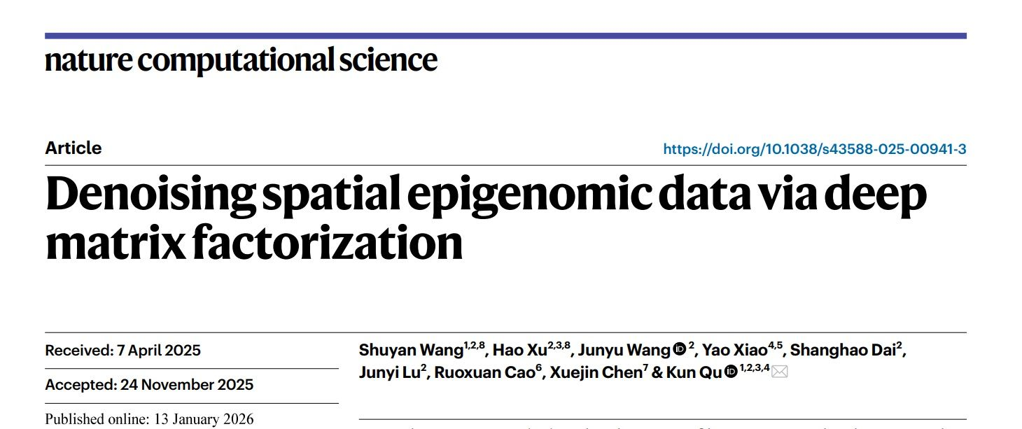 近日,中国科学技术大学瞿昆教授课题组开发了一种基于深度矩阵分解的空间表观组数据去噪算法SPEED。该算法能够以高质量的图谱级单细胞表观数据作为先验,准确实现空间表观数据去噪并辅助一系列下游分析,如表观空间区域识别、基因活性分析等。研究成果以“Denoising spatial epigenomic data via deep matrix factorization”为题,发表于2026年1月13日的《自然•计算科学》(Nature Computational Science)杂志。