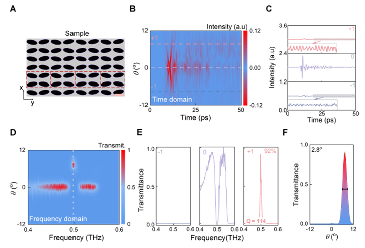 依托超高透射效率的单元设计,团队制备了仅需调控单一参数,即y轴周期的相位梯度超表面,并在实验中实现了卓越的太赫兹波束偏折性能(图3A)。角分辨时域谱测量显示,器件在极窄频谱宽度内将92%能量定向偏折至+1级衍射方向,同时在0级衍射处实现完全抑制(图3B-3E)。得益于q-BIC赋予的窄带共振特性,偏折光束呈现仅2.8°的超小发散角以及高达114的Q值,兼具极高的光谱与空间选择性(图3F)。如此将超高效率、自由支撑薄膜结构与窄带高Q控制集成于同一器件,在太赫兹波束操控领域前所未有,为下一代高性能、低能耗的光子器件提供了强有力的平台支撑。